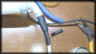 前回、修理したジャンパー線に耐久性が足りず、断線した。 なので、今回は根治するため、断線しているホースの部分を切断して、繋ぐ方法を実施した。 |
