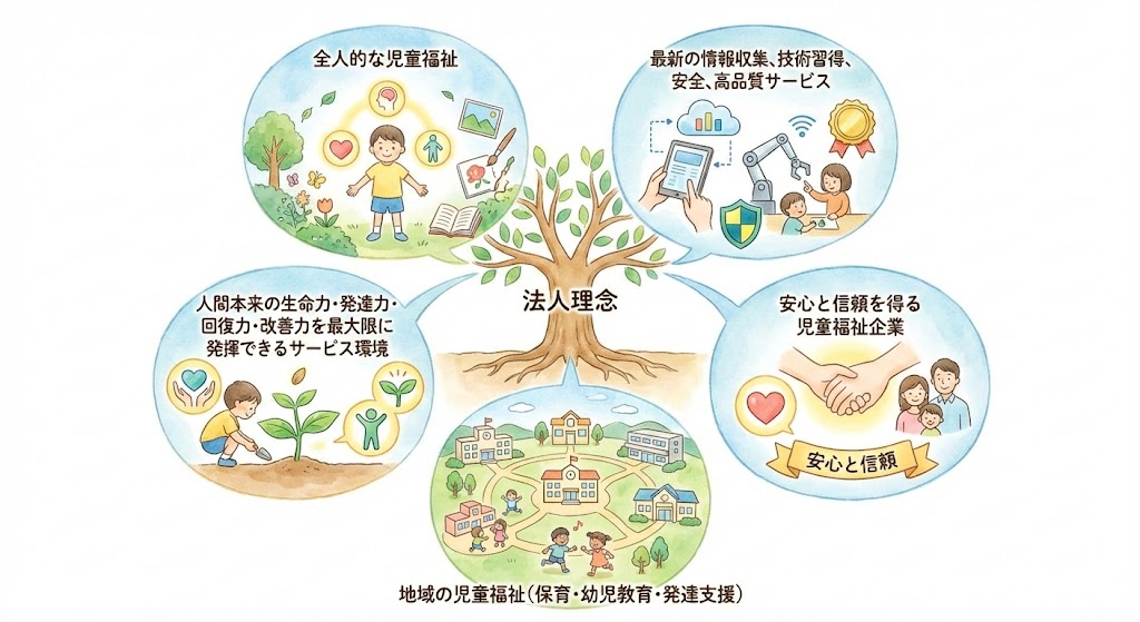 弊社では、児童福祉(保育・幼児教育・発達支援)における専門職として【経営理念】【社員理念】を心に据えて日々の発展と自己の成長を共に推し進める努力を惜しみませんことをここに誓います。