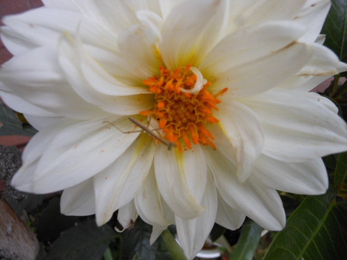花壇のダリアの花に、カマキリの赤ちゃんが